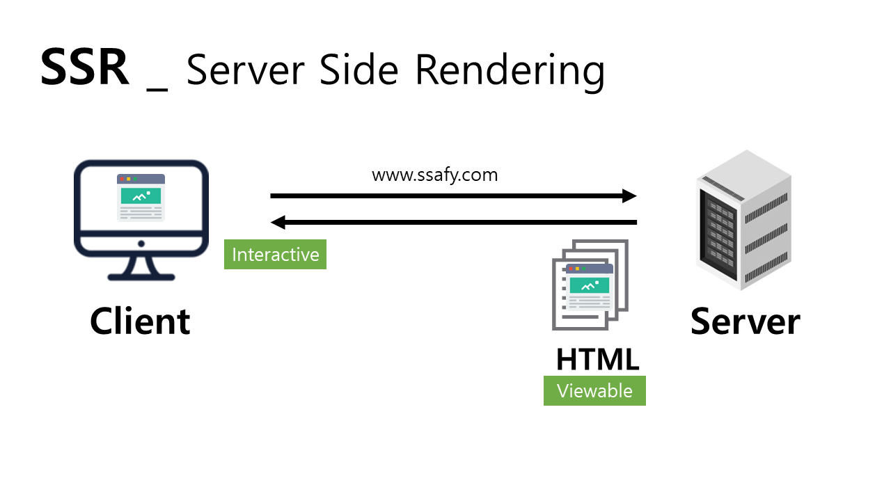 | 장점 | - SEO(검색 엔진 최적화) - 첫 페이지 로딩이 빠름 -User의 네트워크 환경에 환경에 상관없이 페이지 로딩이 가능함. |
