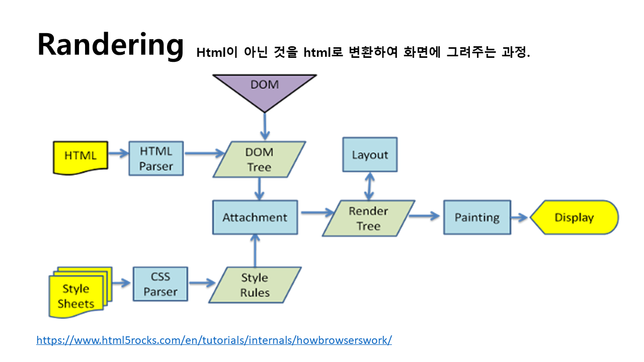 HTML로 DOMTree가 만들어지고, CSS가 CSSOM을 결합시켜 최종적으로 Rendering Tree가 만들어 진다. 그리고, 이렌더링 트리에서 각노드의 크기와 위치를 계산하고, 개별 노드를 화면에 그려주는 과정이 렌더링의 과정이라고 할 수 있다.