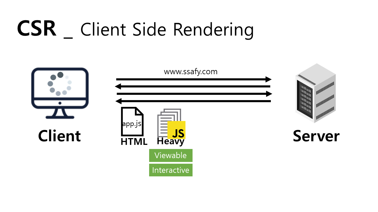 서버에서 빈 HTML파일을 서버로부터 받는다. 이떄, 화면은 빈화면이 뜬다. 서버로부터 다시 링크된 자바 스크립트 파일을 받게되고, 이때, 소스코드 뿐만 아니라 각종 프레임워크까지 포함된 파일을 받는다. 이때 받은 파일을 기반으로 클라이언트에서 렌더링을 하여 화면에 띄워준다.