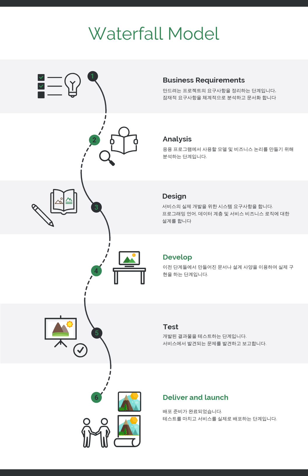 - 개발 도중에 요구사항이 바뀌면 처음 단계부터 다시 돌아가 개발을 진행해야 합니다.