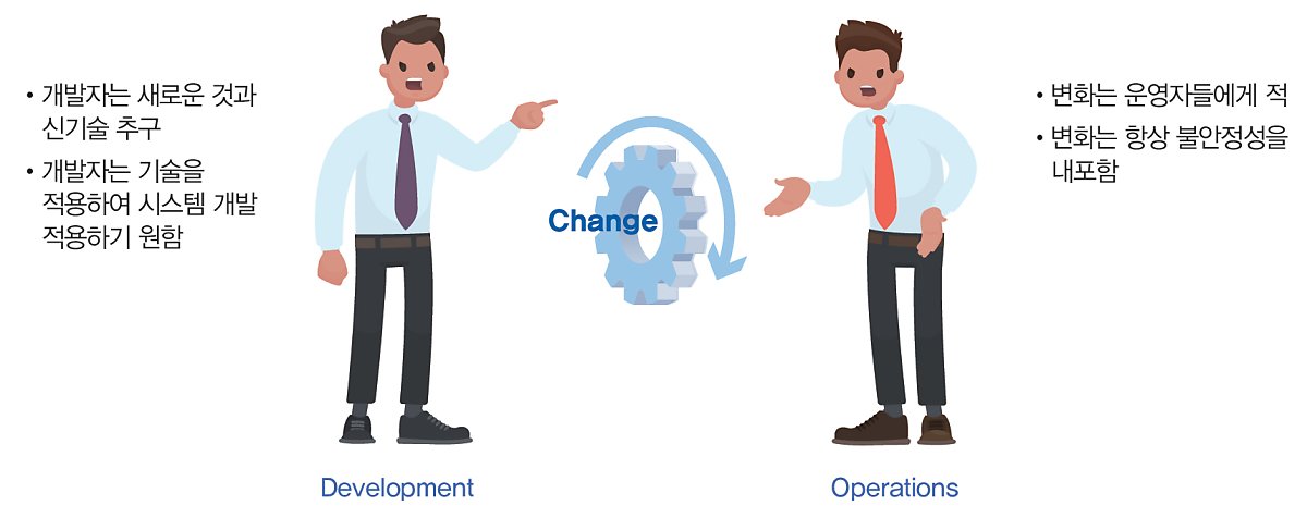 스프린트가 돌아가며 빠른 소프트웨어 개발이 가능해졌는데, 그런 만큼 소프트웨어 배포가 빨라지고, 빌드도 빈번해지며 개발팀과 운영팀 간의 충돌이 발생하게 됩니다. 2000년대 중반을 넘어오면서 소프트웨어는 시장이 웹 서비스로 넘어가면서 개발만큼이나 안정적인 운영이 중요해졌는데, 안정적인 운영은 개발의 속도를 늦추기 마련이고, 빠른 개발을 선호하는 문화는 안정적인 운영에 방해가 되었기 때문입니다.