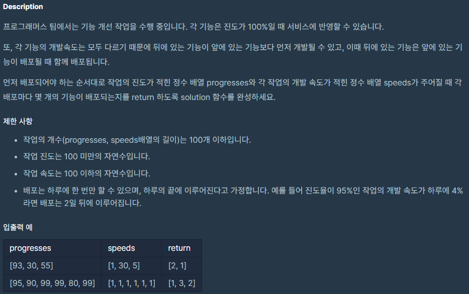 프로그래머스 팀에서는 기능 개선 작업을 수행 중입니다. 각 기능은 진도가 100%일 때 서비스에 반영할 수 있습니다. 또, 각 기능의 개발속도는 모두 다르기 때문에 뒤에 있는 기능이 앞에 있는